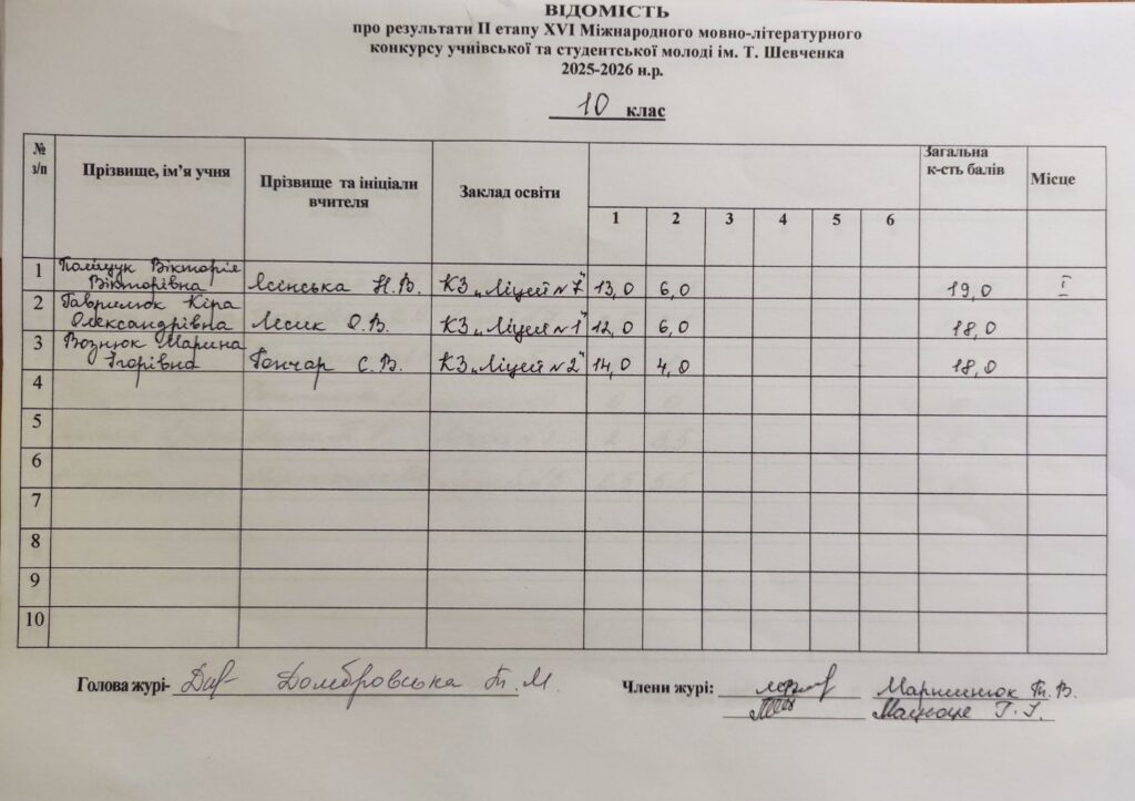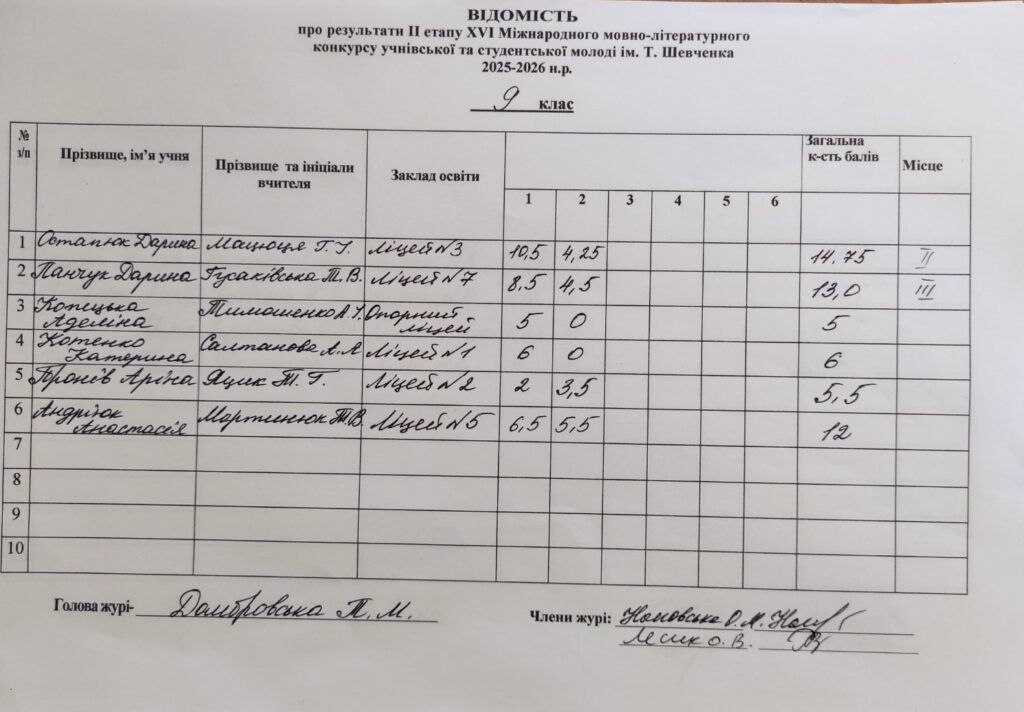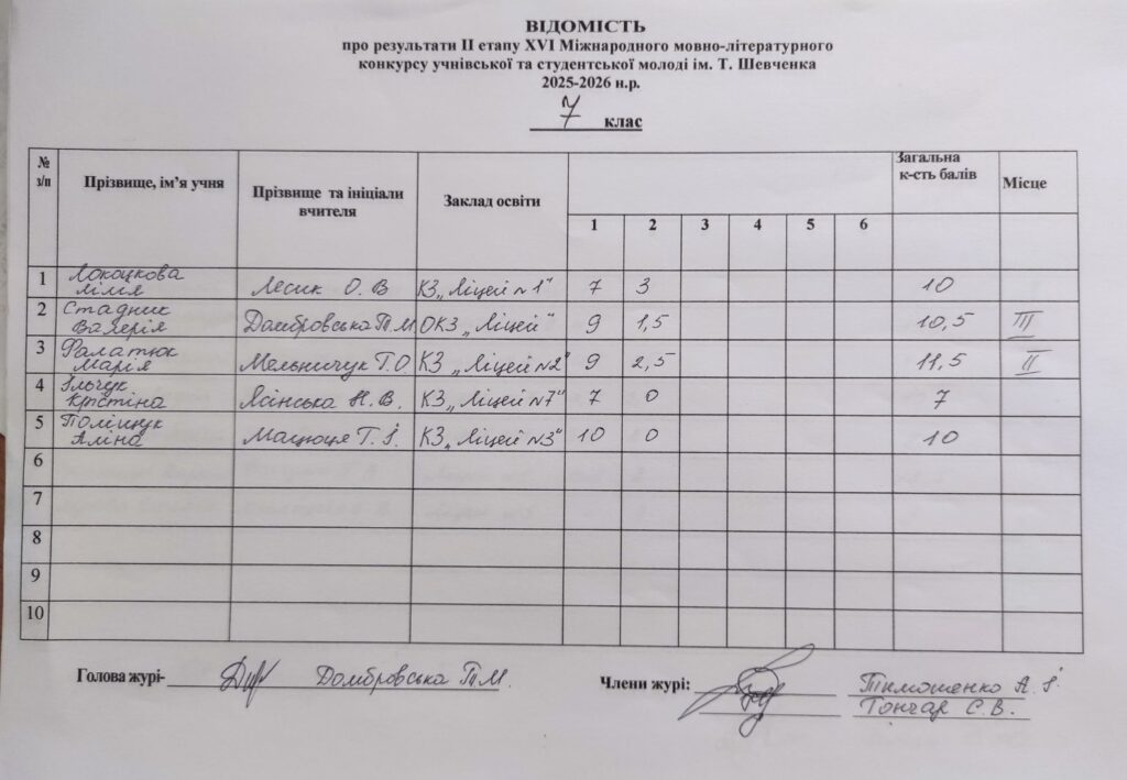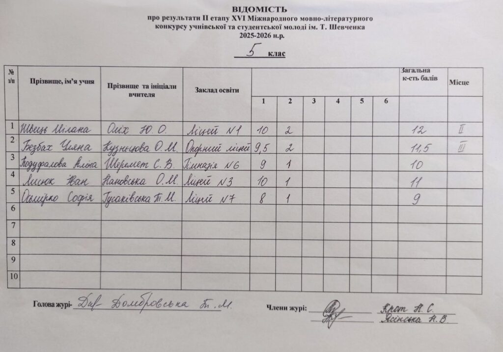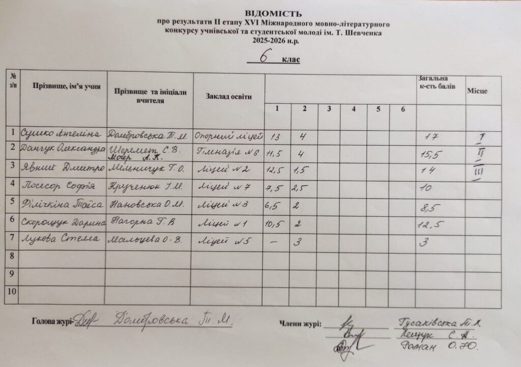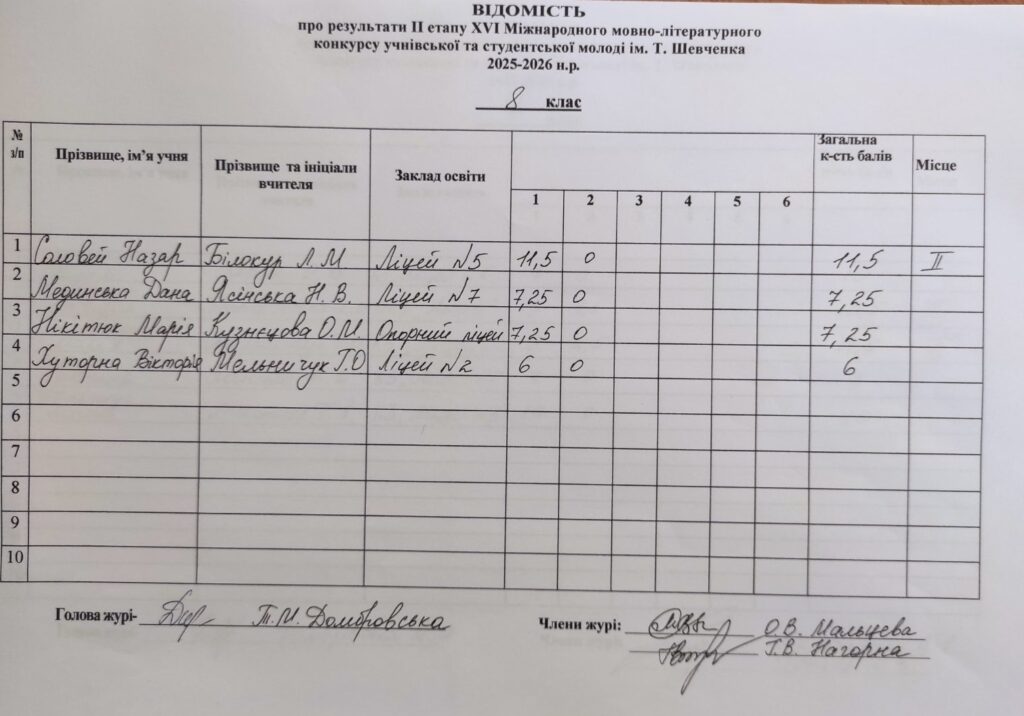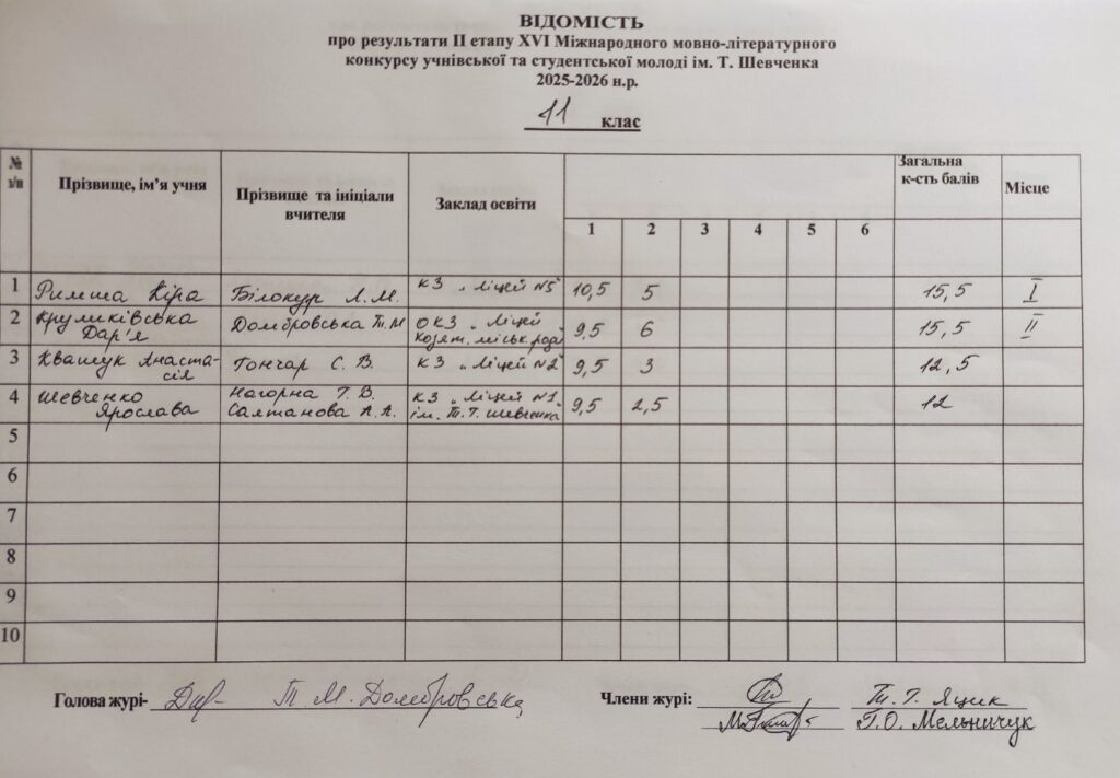 Відомість про результати ІІ етапу ХVI Міжнародного мовно-літературного конкурсу учнівської та студентської молоді ім.Т.Г.Шевченка 2025/2026 н.р.