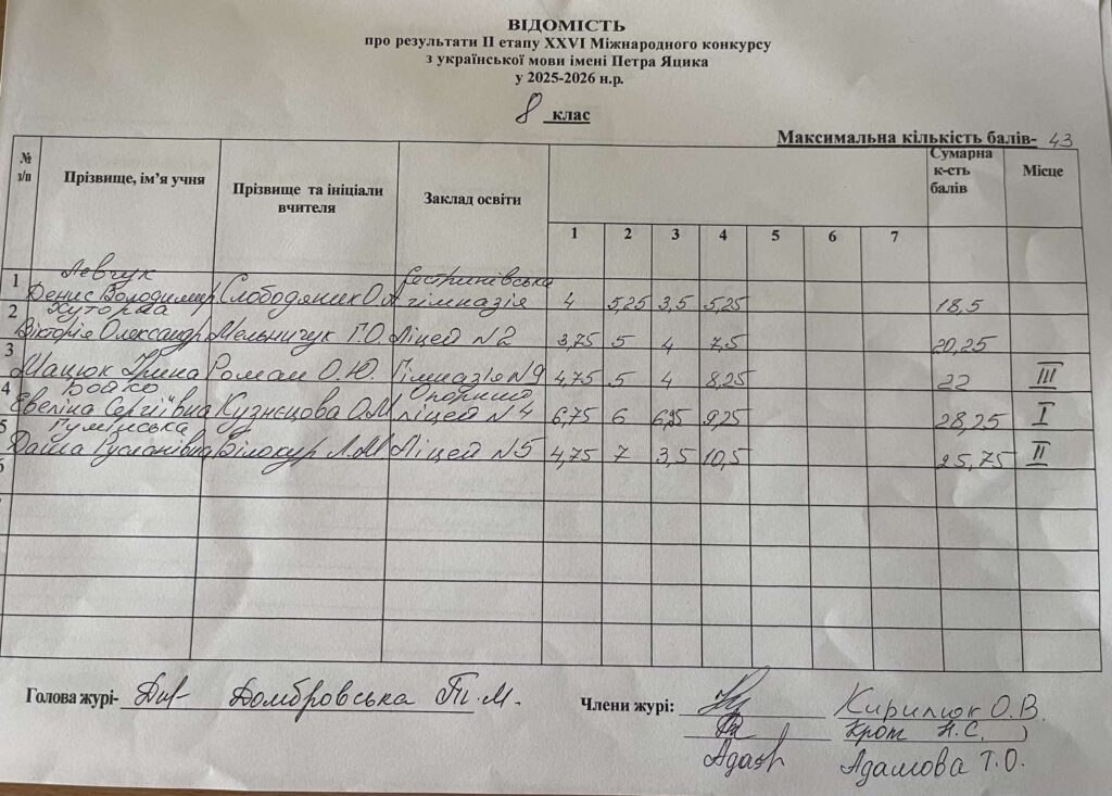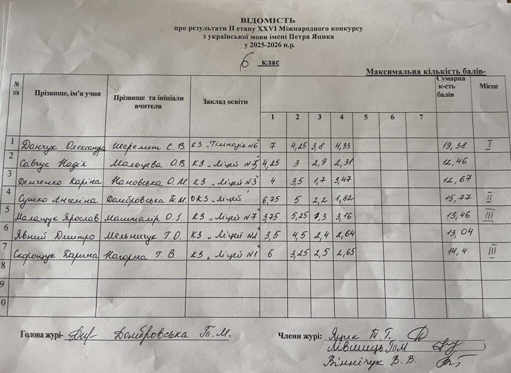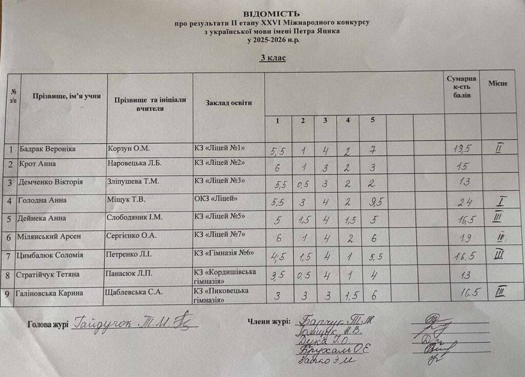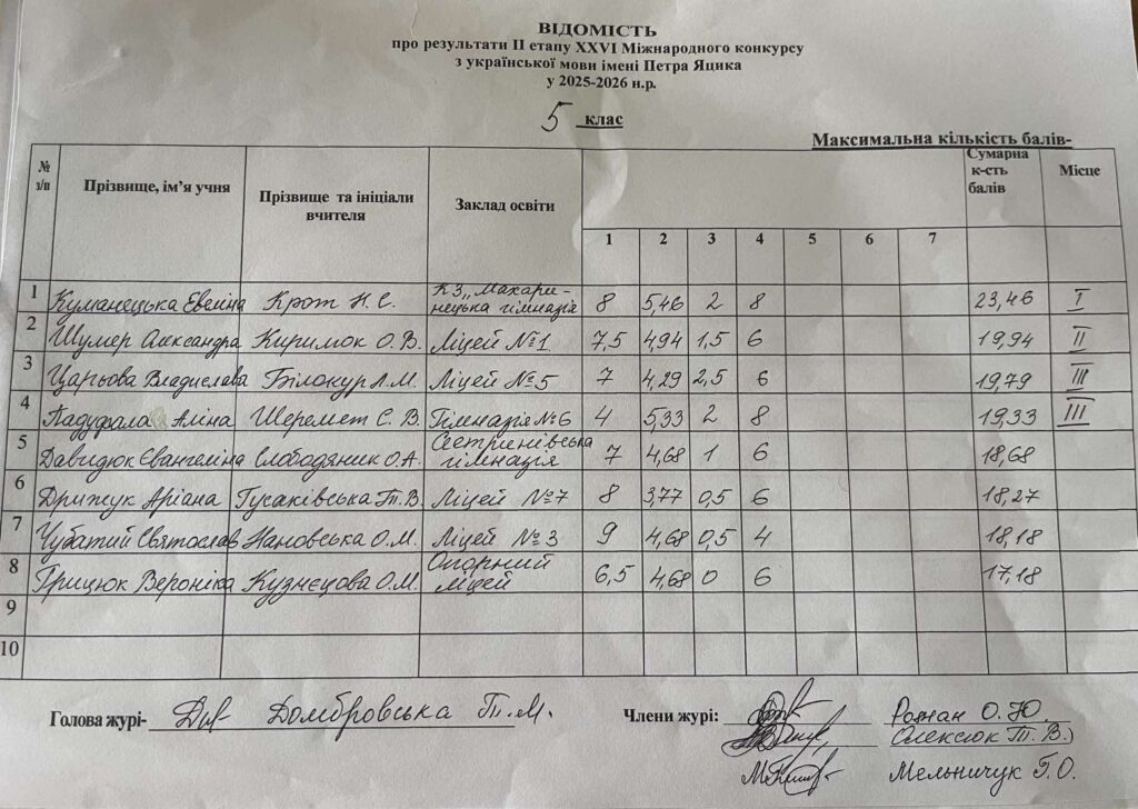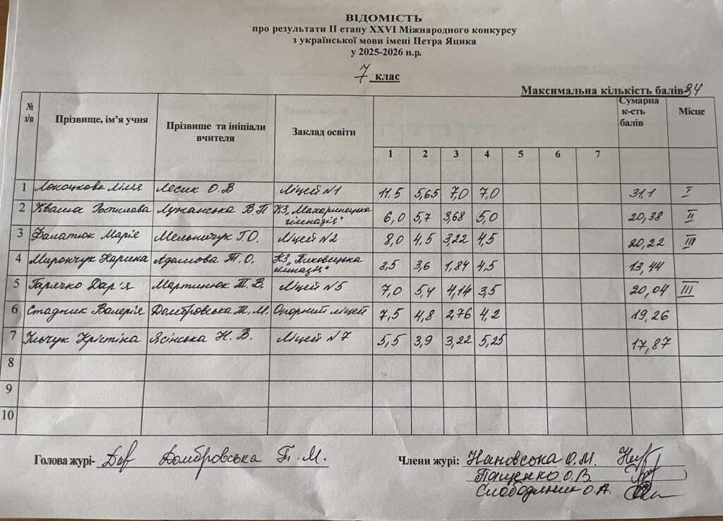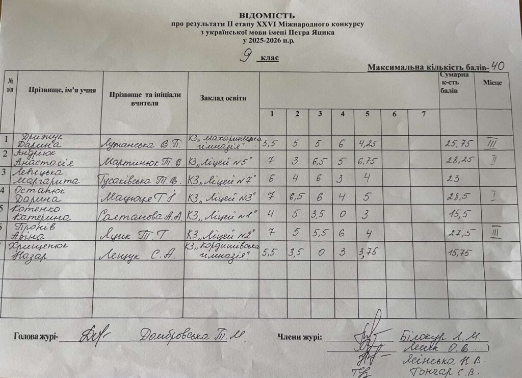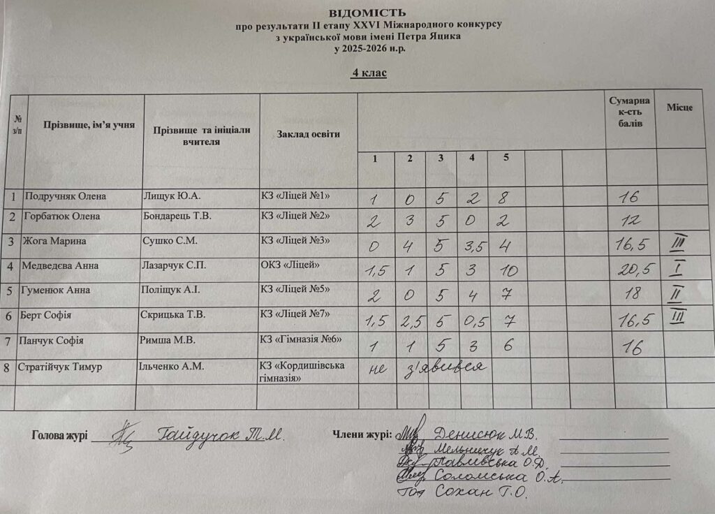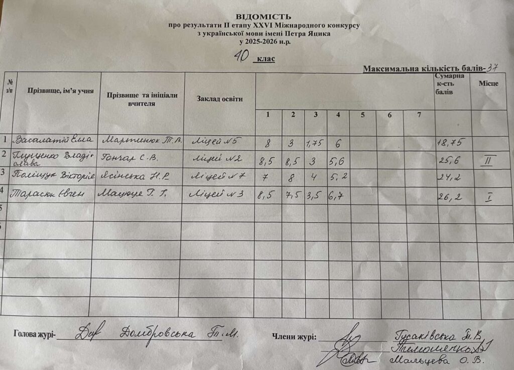 Відомість про результати ІІ етапу ХХVI Міжнародного конкурсу з української мови ім.Петра Яцика 2025/2026 н.р.