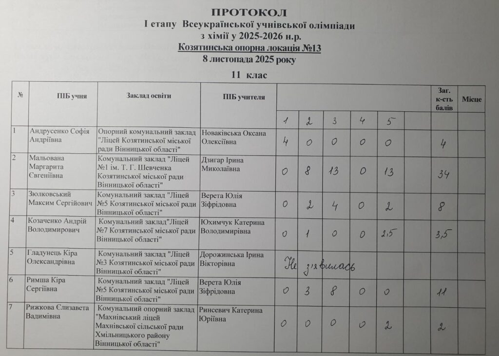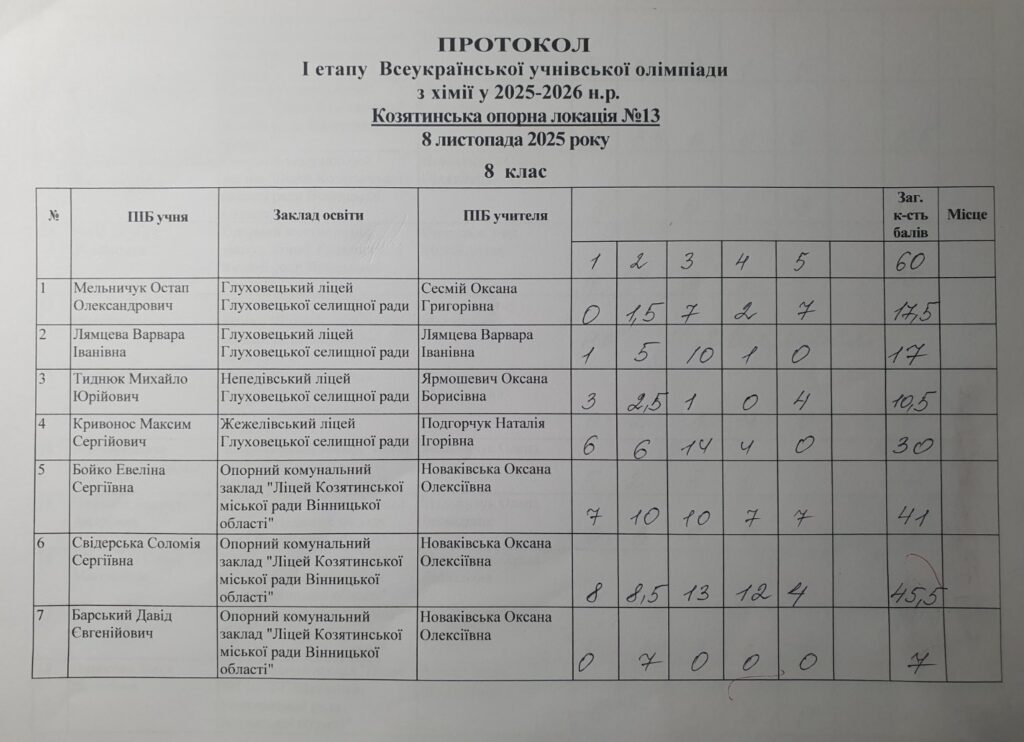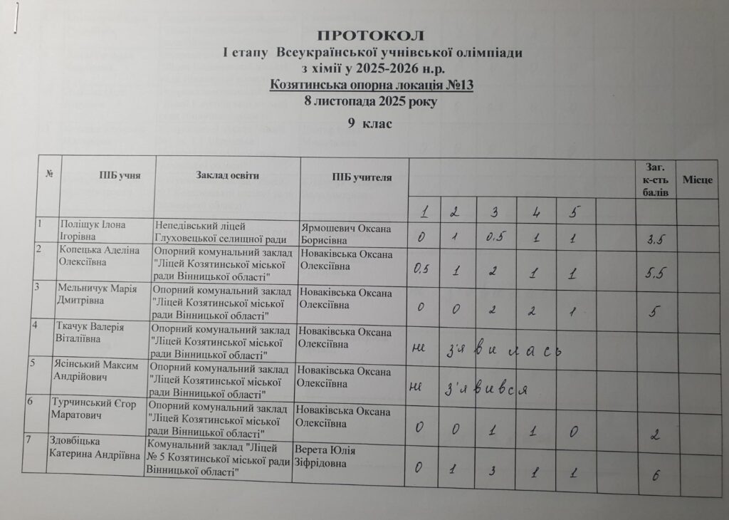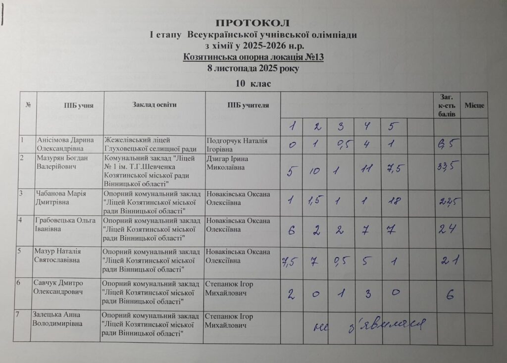 Протокол І етапу Всеукраїнської учнівської олімпіади з хімії у 2025/2026 навчальному році