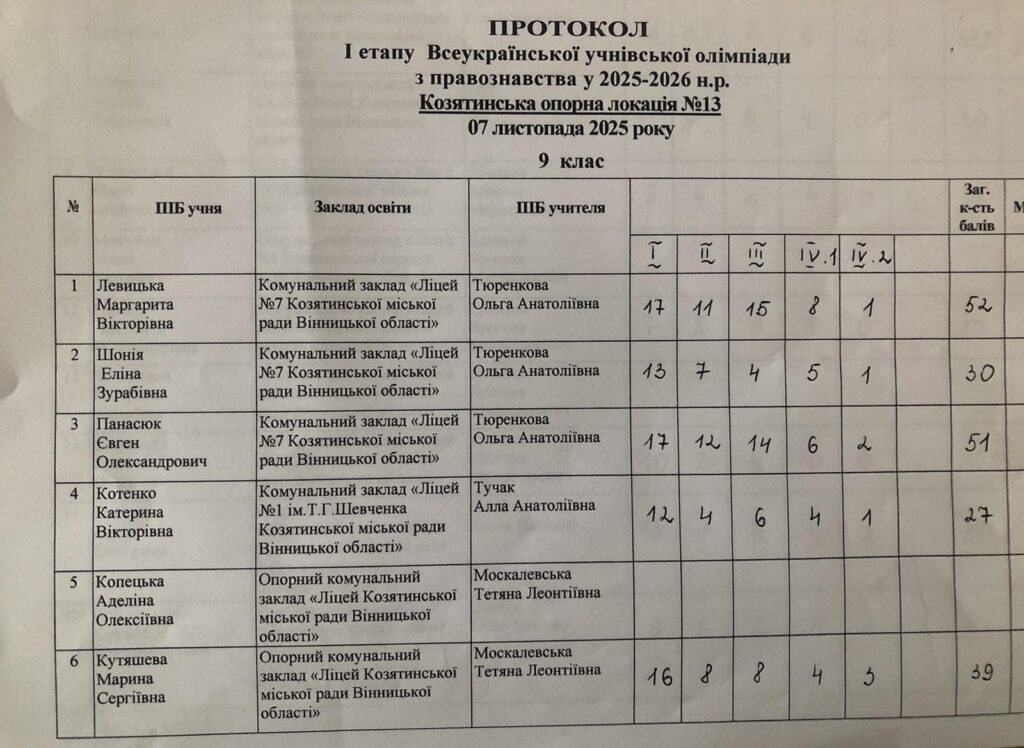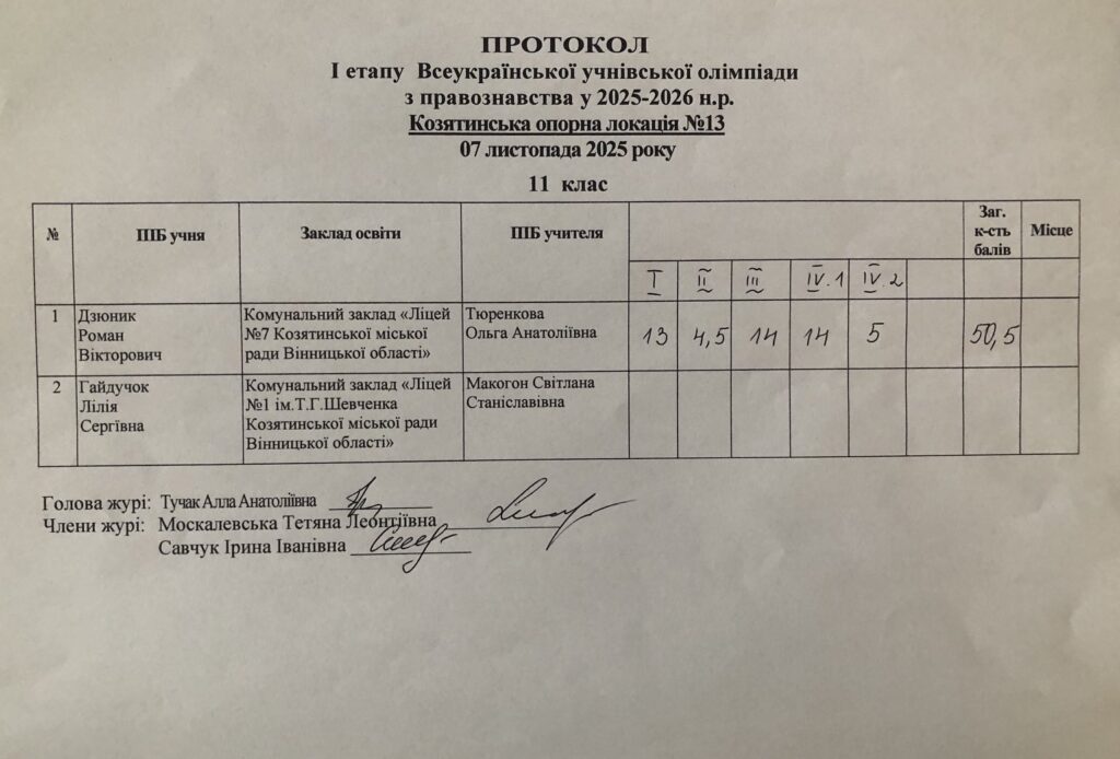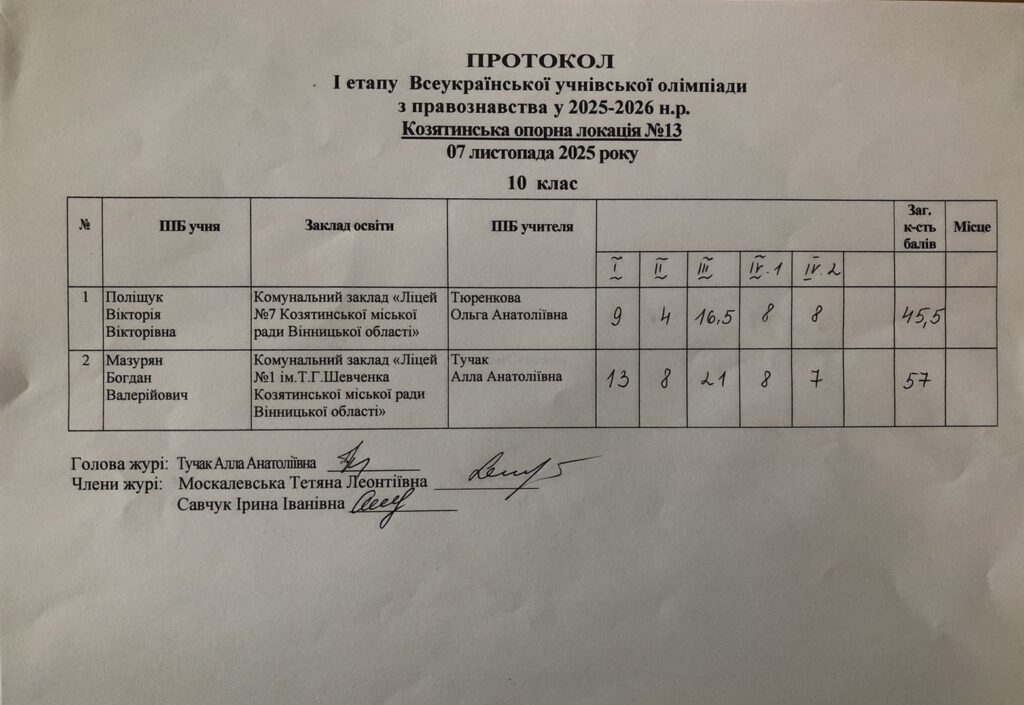 Протокол І етапу Всеукраїнської учнівської олімпіади з правознавства у 2025/2026 навчальному році