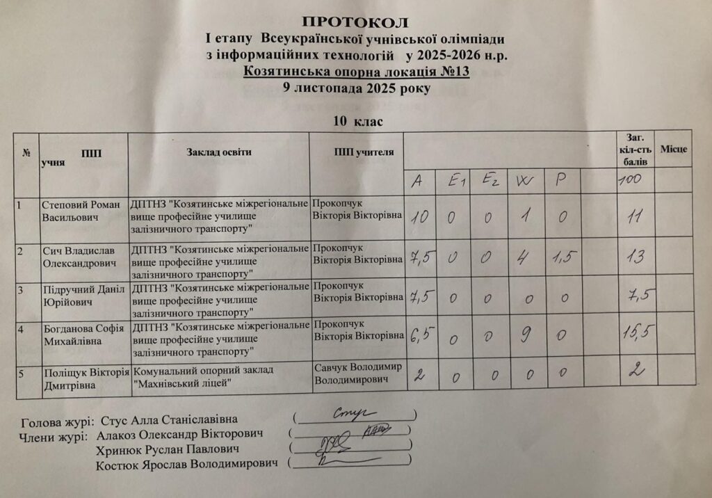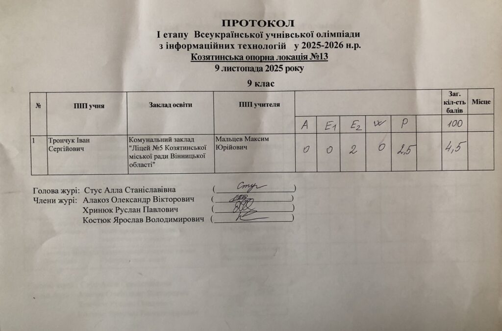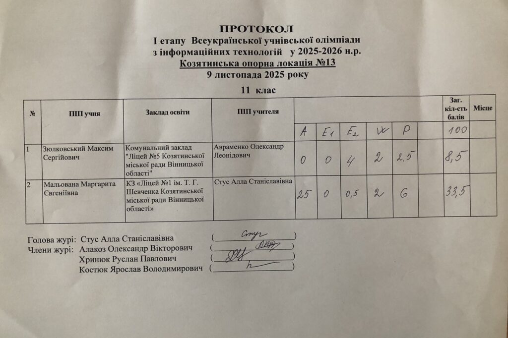 Протокол І етапу Всеукраїнської учнівської олімпіади з ІКТ у 2025/2026 навчальному році